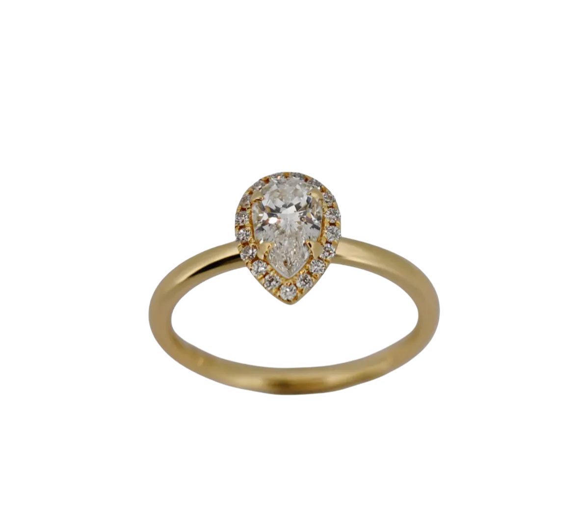 Ein Diamant im Tropfenschliff (engl. Pear Cut) hat – wie der Name schon sagt – eine tropfen- oder auch birnenähnliche Form. Dieser besondere Schliff stellt dabei eine Kombination aus dem Brillant- und dem Marquise Schliff dar, wodurch der Diamant ein spitzes und ein rundes Ende hat. Fachsprachlich wird diese Schliffart auch Pendeloque-Schliff genannt, da seine Form an das Pendel einer Uhr erinnert (franz. pendule). Beim Schleifen der Diamanten muss vor allem auf die Symmetrie geachtet werden, damit nicht eine Seite ausgeprägter und breiter ist als die andere. Der Tropfenschliff eignet sich besonders für Verlobungsringe, da dort meistens ein großer Diamant in der Mitte eingefasst ist, der mit diesem Schliff heraussticht. Ebenfalls ist der Pear Cut häufig bei Solitärringen zu finden. Durch die Verwandtschaft zum Brillantschliff strahlen diese Diamanten fast genauso wie Brillanten, da sie eine hohe Anzahl an Facetten aufweisen. Die natürliche Farbe der Diamanten ist besonders an der Spitze deutlich zu erkennen. Diamanten im Tropfenschliff sind durch die besondere Form Hingucker, die den Finger auch optisch strecken. Eingefasst werden diese Diamanten meistens durch eine Krappenfassung, wobei diese den Edelstein besonders am spitzen Ende gut schützen muss.